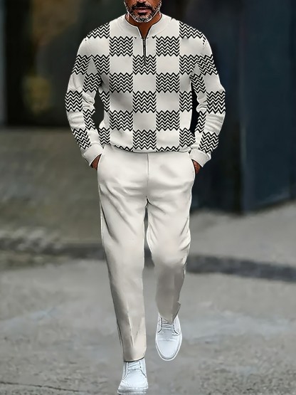 Men's Casual White & Black Color Matching Striped Printed Round-Neck Zipper Long Sleeved Trousers Two-Piece Set