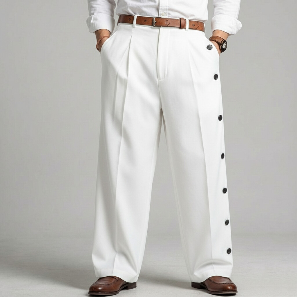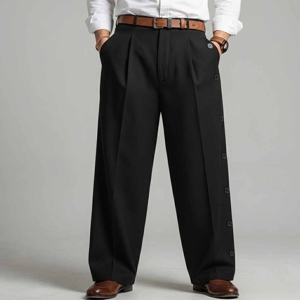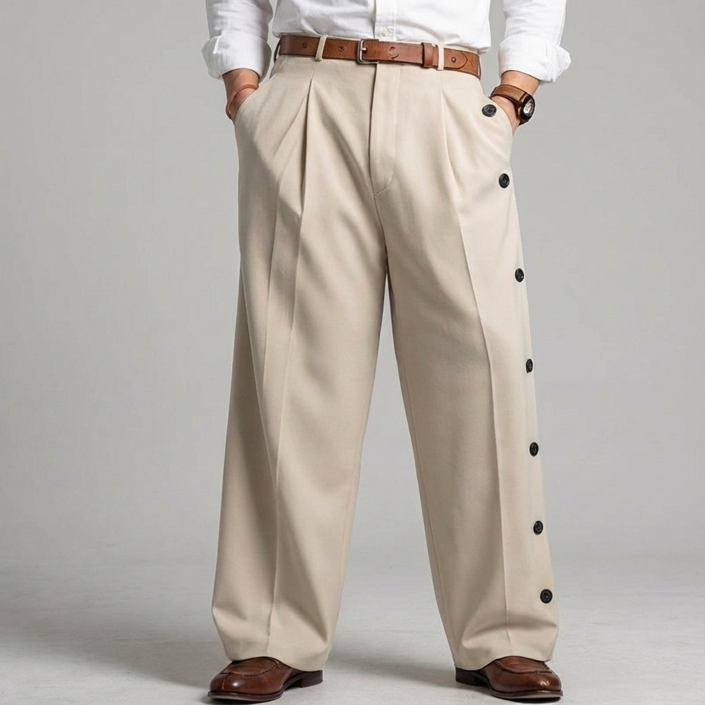 Details: Button Decor, Mid Rise, Slant Pocket, Wide Leg