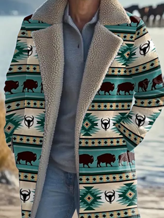 Men's Retro Western Aztec Bufflo Print Plush Coat
