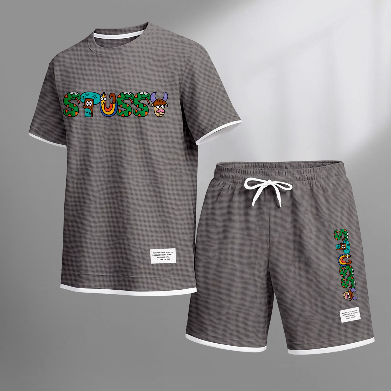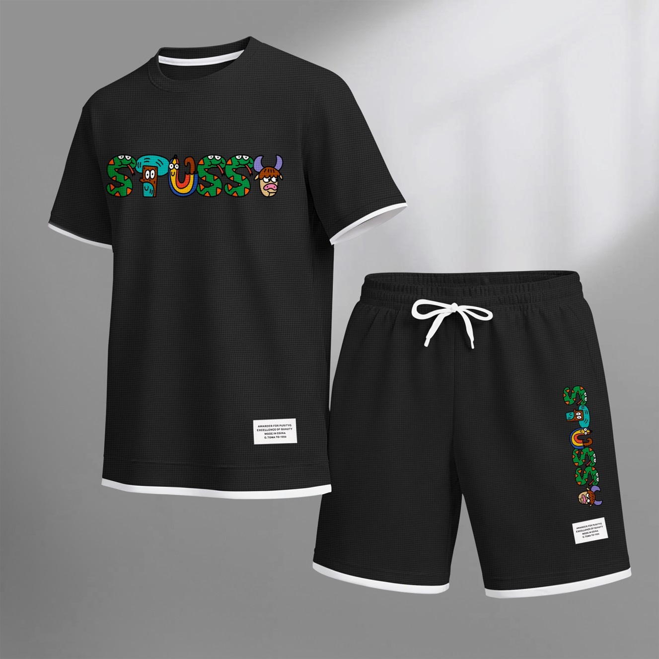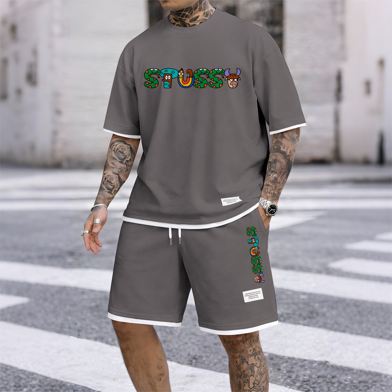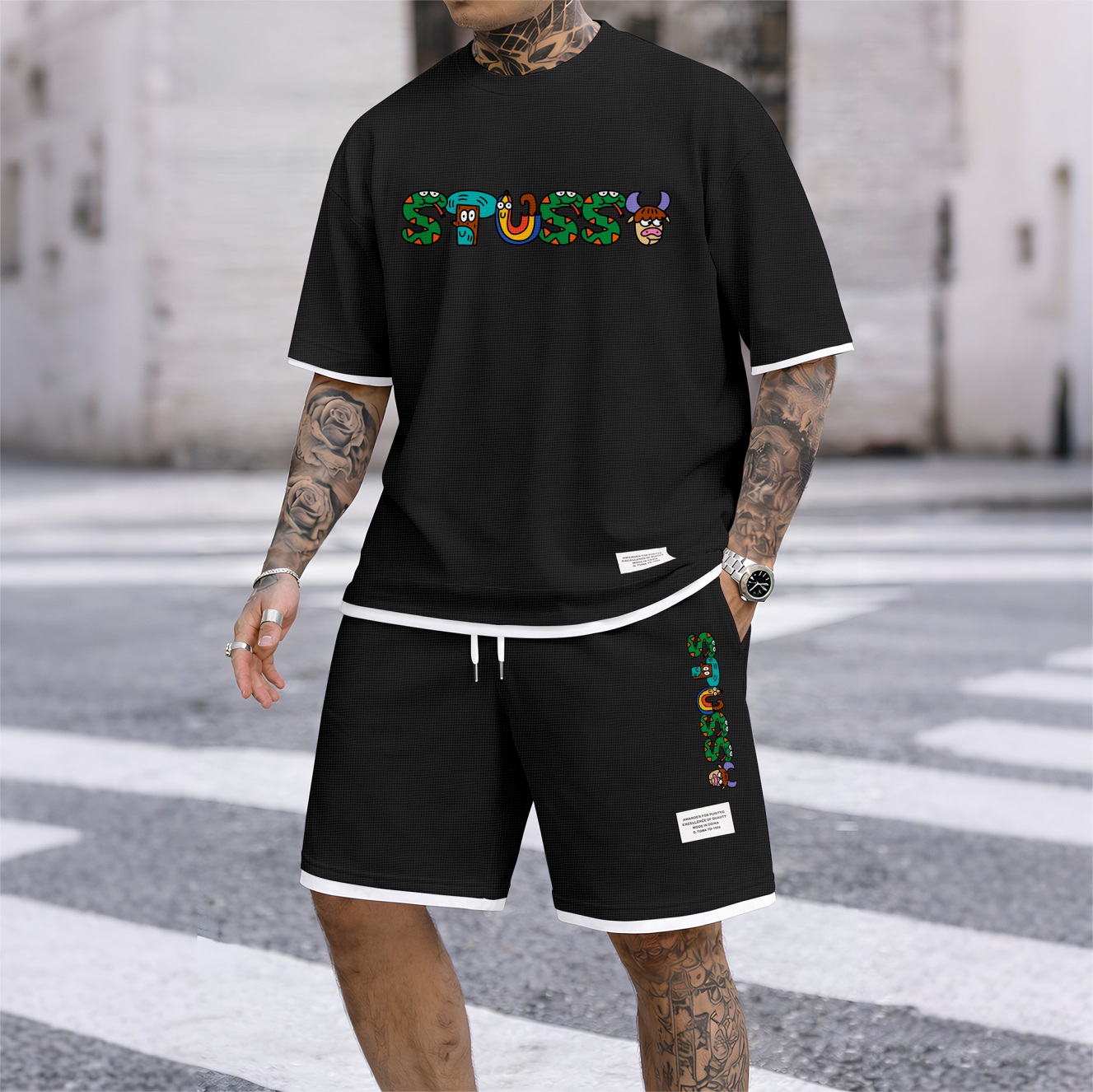 Men's Y2K Cartoon Print Waffle Fabric Short-Sleeved Shirt And Shorts Set