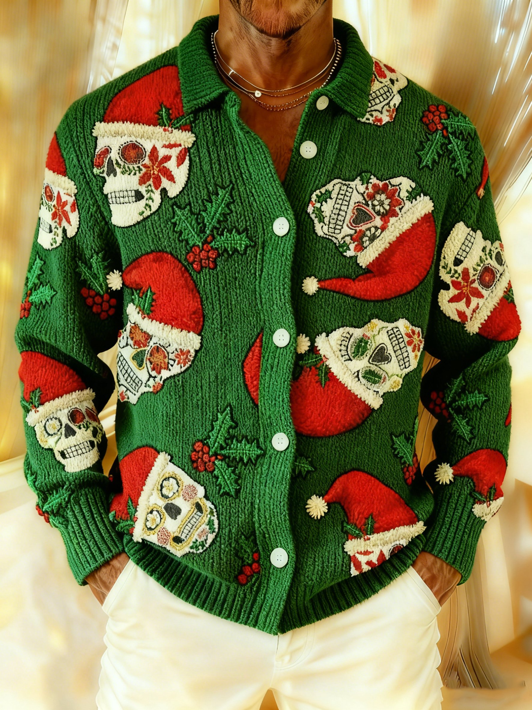 Men’s Xmas Skeleton Christmas Sugar Skulls Soft Cozy Knit Cardigan Shirt