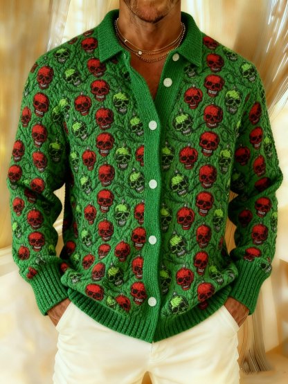 Men’s Xmas Skeleton Christmas Skullfull Holiday Ornaments Red and Green Soft Cozy Knit Cardigan Shirt