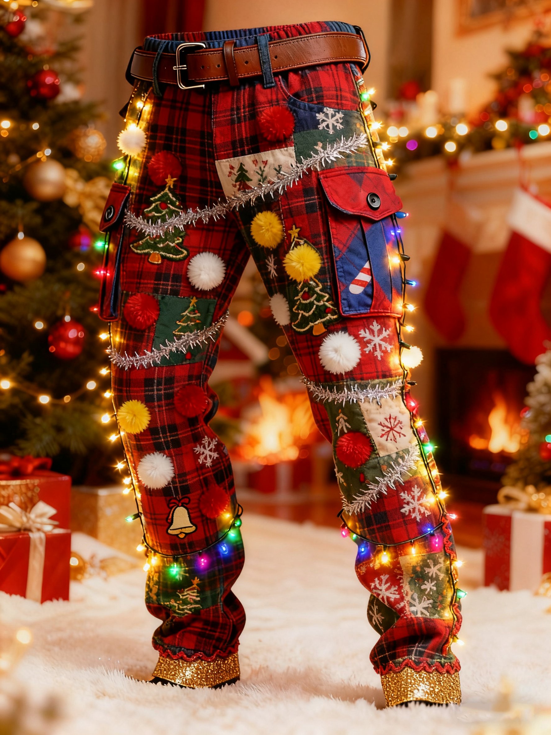 Men's Christmas Bells Holly Berries Candy Cane Plaid Printed Cargo Pants