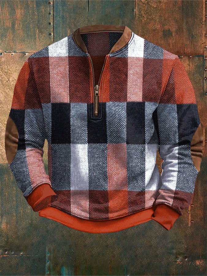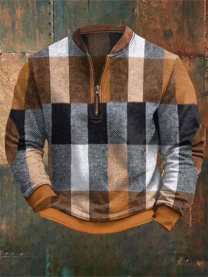 Men's Retro Western Textured Print Zipper Neck Knit Sweatshirt