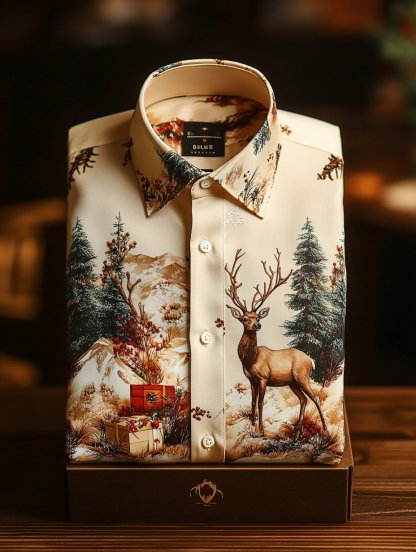 Men's Business Retro Christmas Gift Elk Print Long Sleeve Shirt