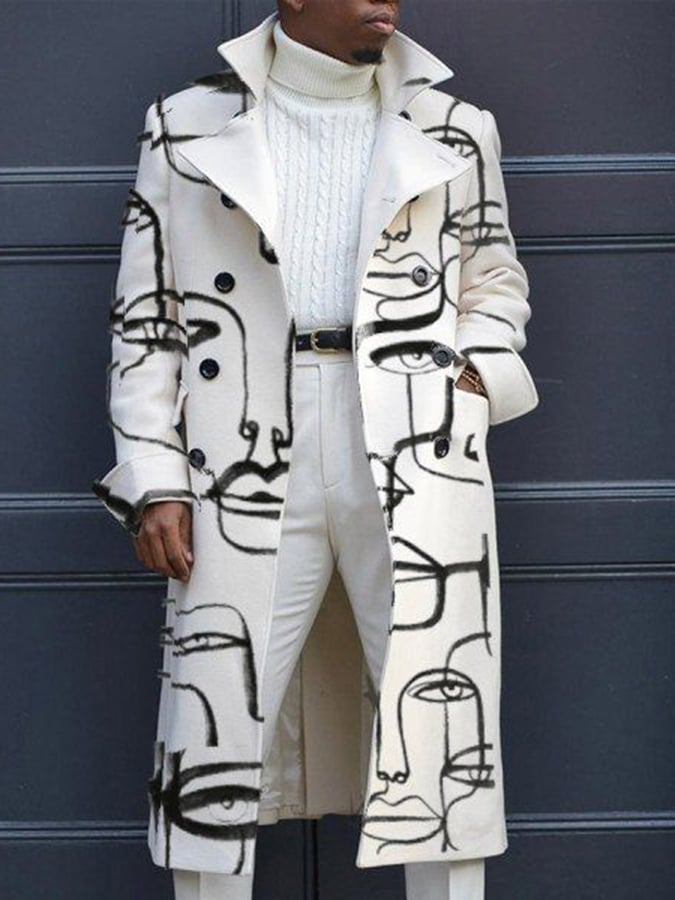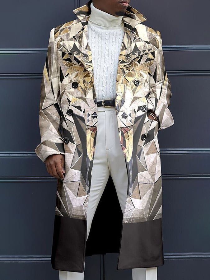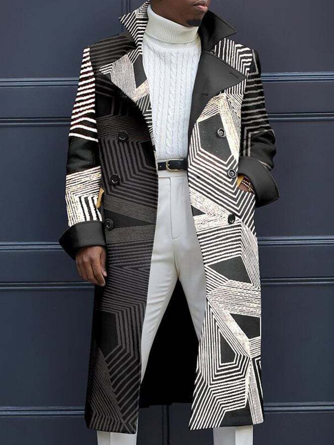 Men's Retro Geometric Print Double-Breasted Casual Trench Coat