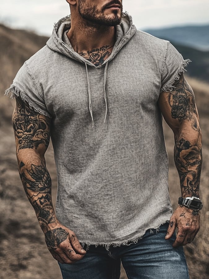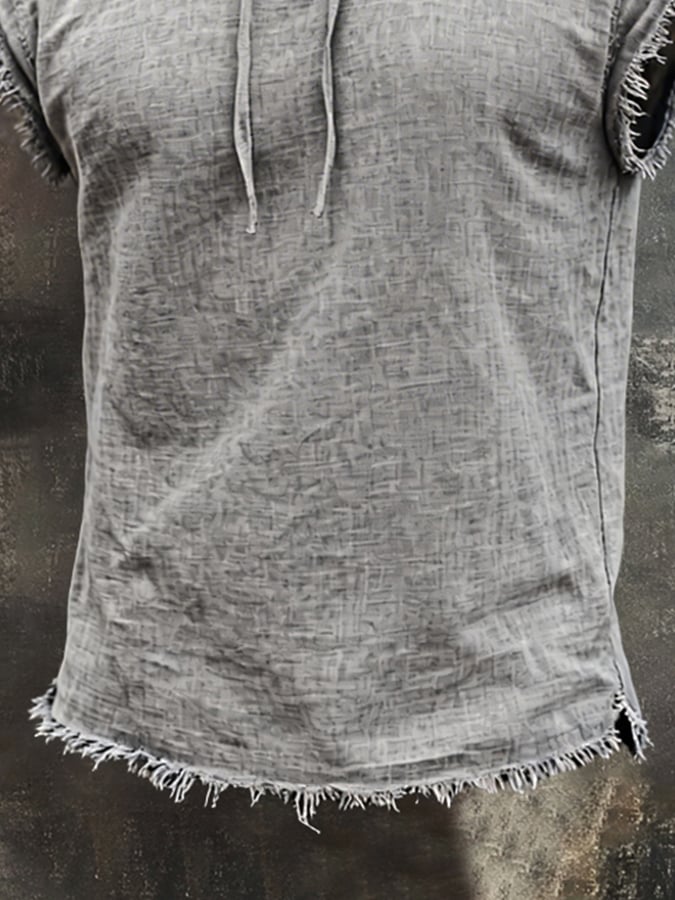 Men's Retro Cotton-Linen Frayed-Hem Hooded Short-Sleeve T-Shirt