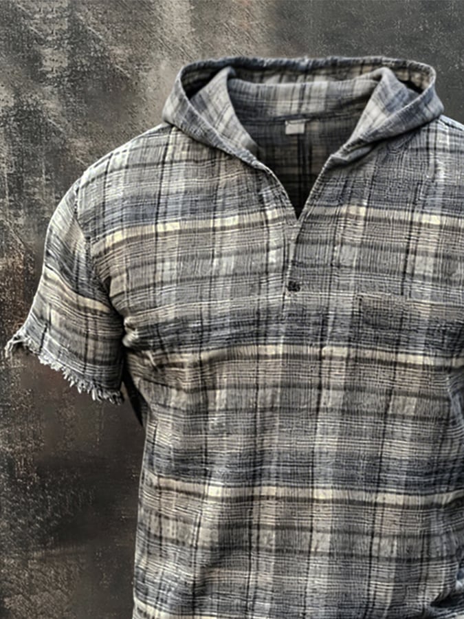 Men'S Retro Plaid Cotton-Linen Short-Sleeve Hoodie With Frayed Hem