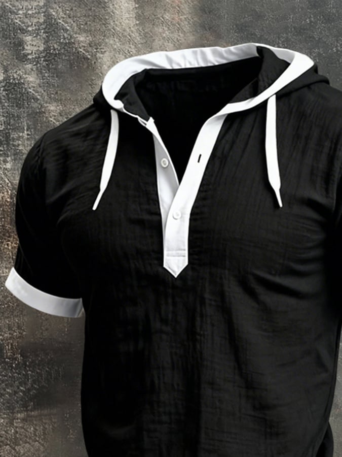 Men'S Retro Cotton-Linen Short-Sleeve Hoodie With Color-Block Paneling