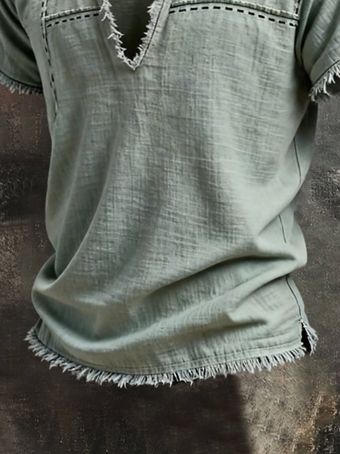 Men'S Retro Cotton-Linen Short-Sleeve Top With Linear Pattern And Frayed Edges