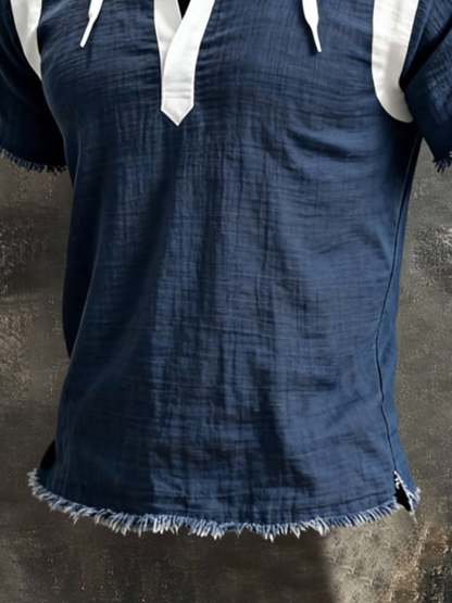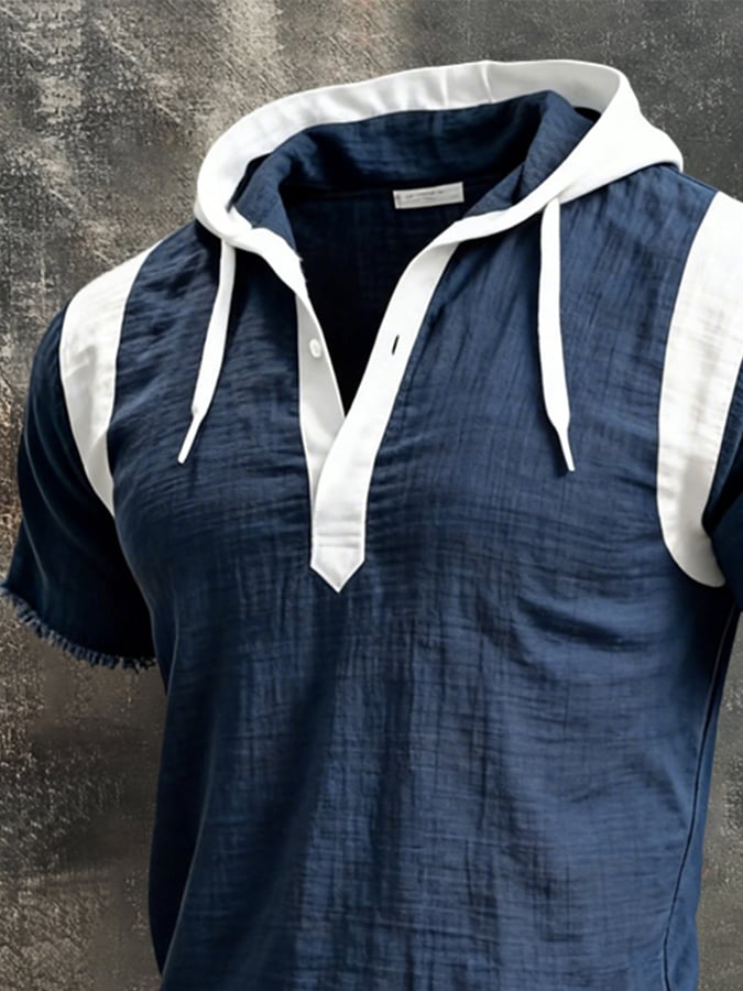 Men'S Retro Cotton-Linen Short-Sleeve Hoodie With Color-Block Paneling